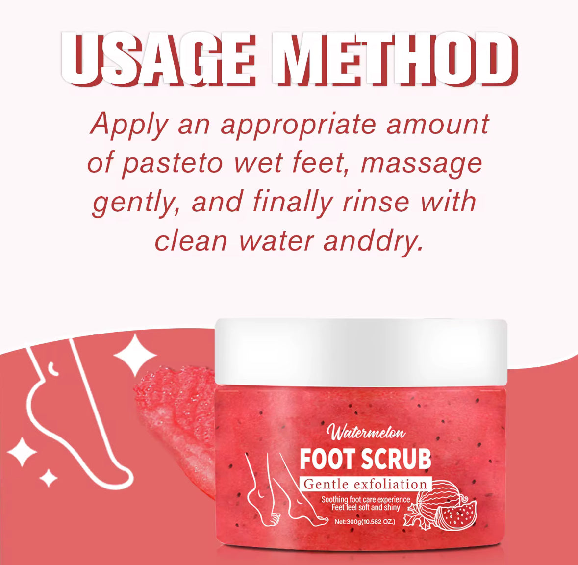 Modo de empleo: Aplicar sobre pies húmedos, masajear delicadamente con movimientos circulares, luego enjuagar con agua tibia.